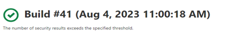 You can configure the build to fail based on the security results such as a specified number of high severity vulnerabilities. The sample message in Jenkins build in such a case is shown below.