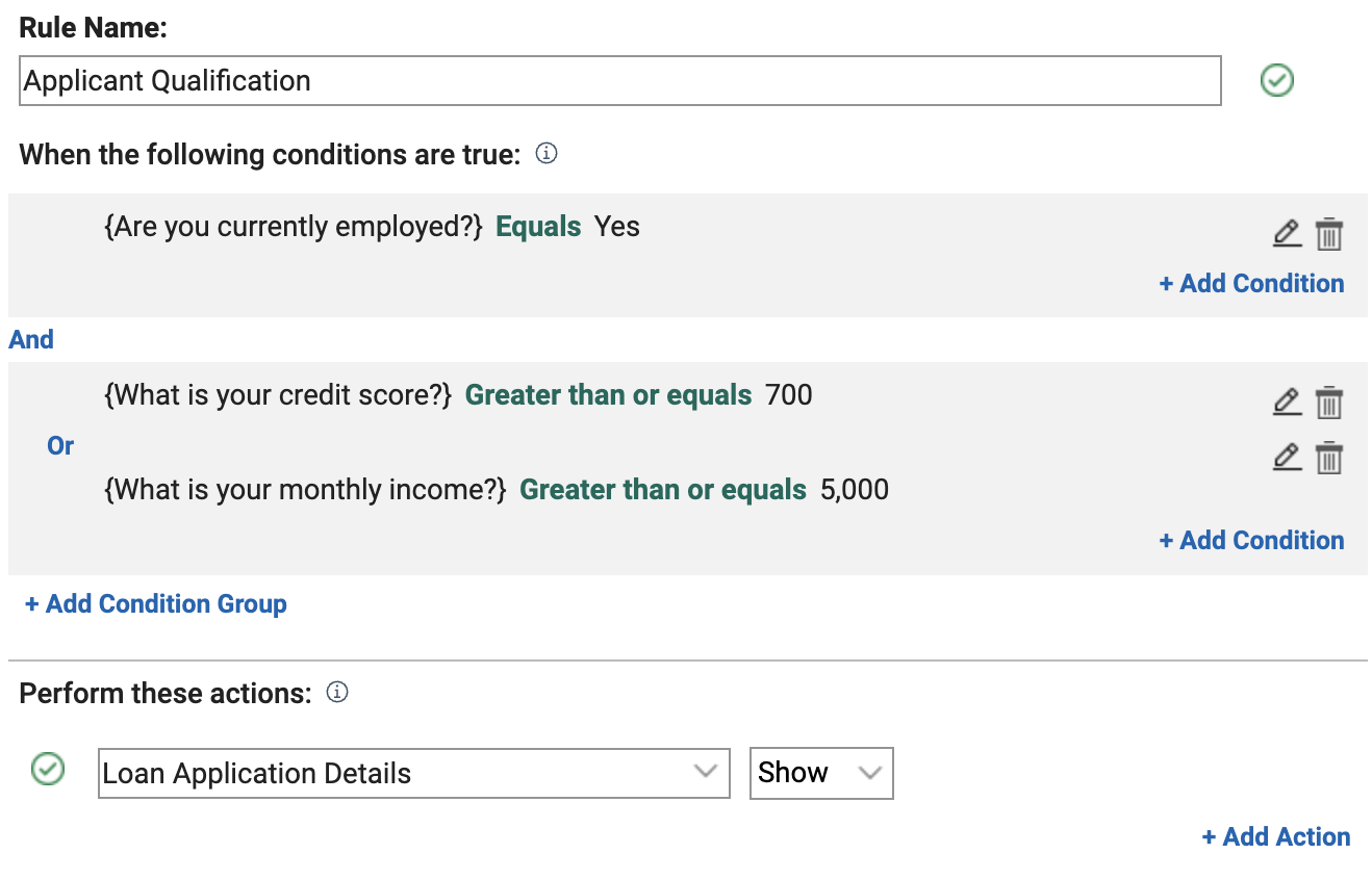 For example, a loan application form might require an applicant to be employed AND have a credit score of at least 700 OR an income of $5,000 per month. With the improved rule setup, this logic is now easier to configure, reducing errors and improving application processing.