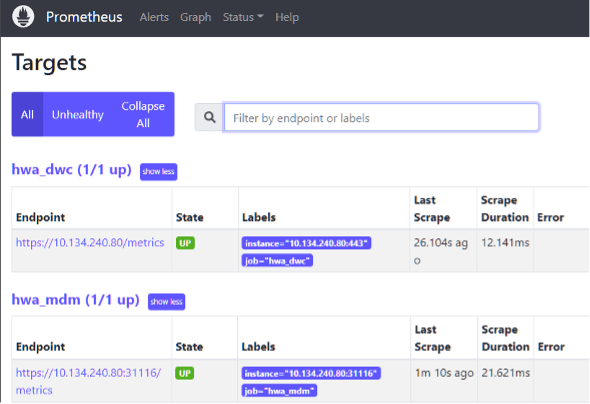Once performed, the endpoints will be available on the HTTP/HTTPS ports: https://MDMIP:31116/metrics and https://DWCIP:9443/metrics
