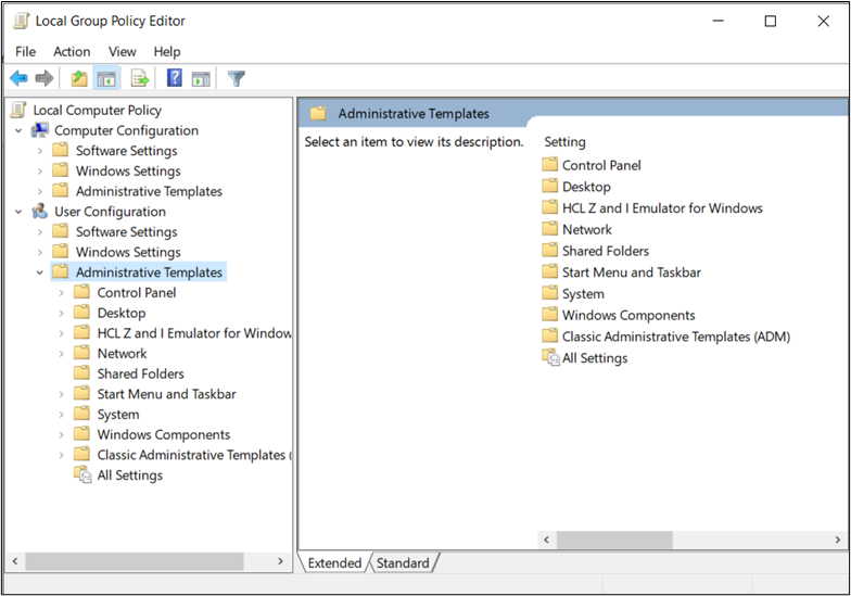 - From windows machine open gpedit.msc and navigate to User Configuration->Administrative Templates.