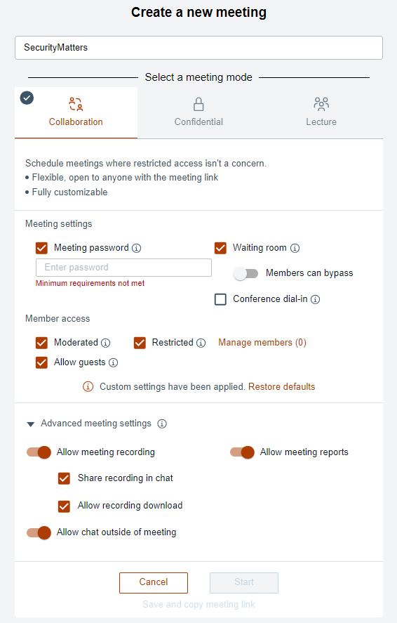 여러 개의 회의 모드 중에서 선택할 수 있어 보안 수준을 조정할 수 있습니다.